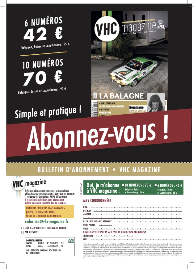 Vous pouvez régler votre abonnement par chèque (à l’ordre de Centquatre édition), par courrier adressé à : Centquatre édition, Service Abonnement, 1 résidence des Quinconces, 91190 Gif-sur-Yvette ou par virement. Le RIB est disponible à la rédaction, vous pouvez le demander à redaction@vhc-magazine.fr